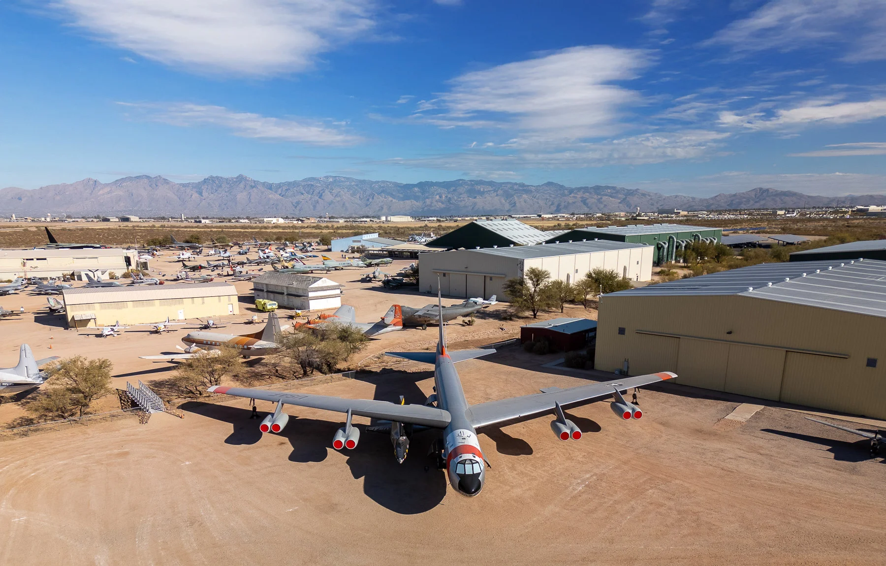 All of the museum buildings are accessible. The floors are poured cement. Accessible parking spaces (handicapped permit required) are located near the entrance to the museum. A paved walkway connects the Main Hangar, Hangar 3, 4 and 5 while the remainder of the outdoor acreage is generally hard-packed dirt. It can be difficult for a thin-wheeled vehicle to move easily in the areas with loose sand when viewing the 150 aircraft outdoors.