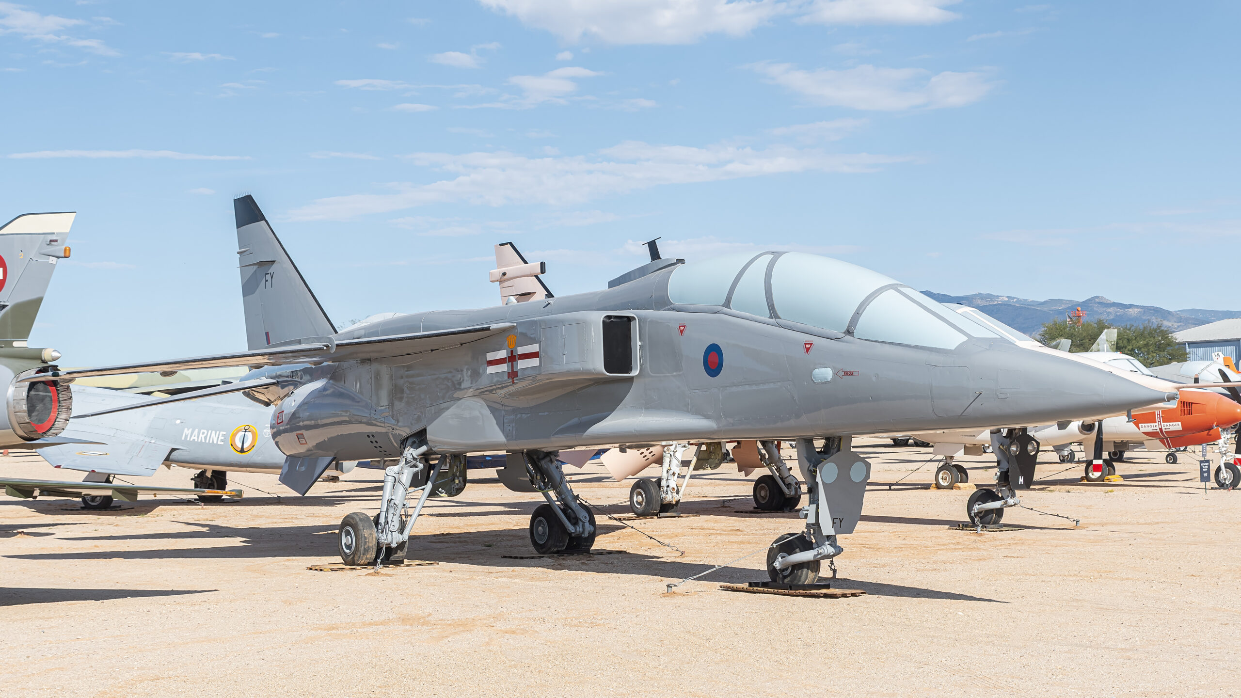 SEPECAT was a joint venture between the French Breguet Company and the British Aircraft Corporation to produce a new supersonic jet trainer for the Royal Air Force and the French Air Force that could also be used as a light attack aircraft by the French. Begun in 1965, the design of what would become the Jaguar was complicated by the merger of Breguet and Dassault, as well as changing requirements from both air forces. By the time the design was finalized, the aircraft had evolved into a single-seat strike fighter with nuclear capability, optimized for low-altitude operation, as well as a two-seat trainer version, the Jaguar B/Jaguar T2. As a trainer, it also had a secondary strike and ground attack role. It was equipped for in-flight refueling and armed with a single Aden cannon. The display variant is a T4 upgraded to Jaguar 96 standard, an avionics program designed for attack capabilities.