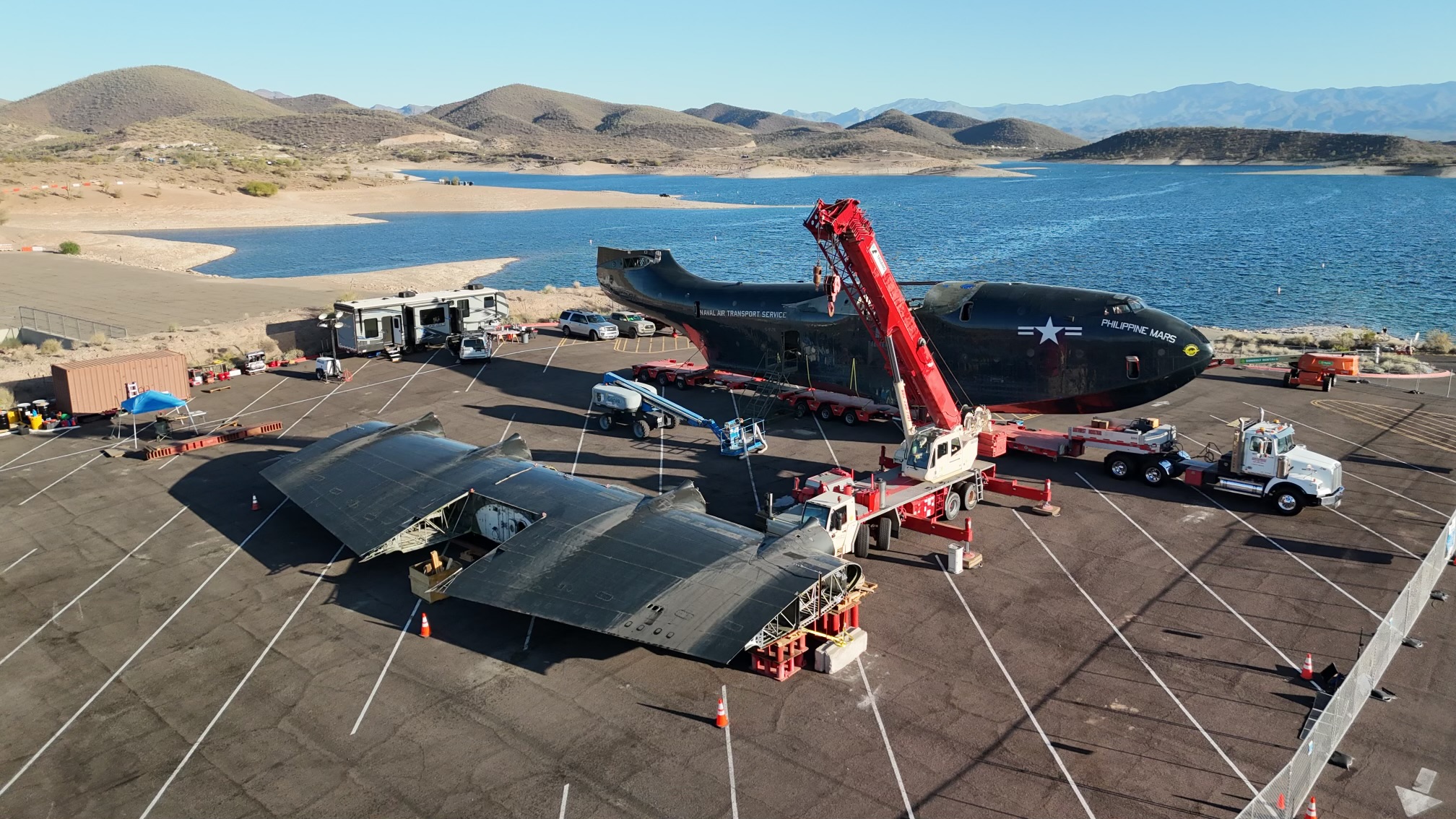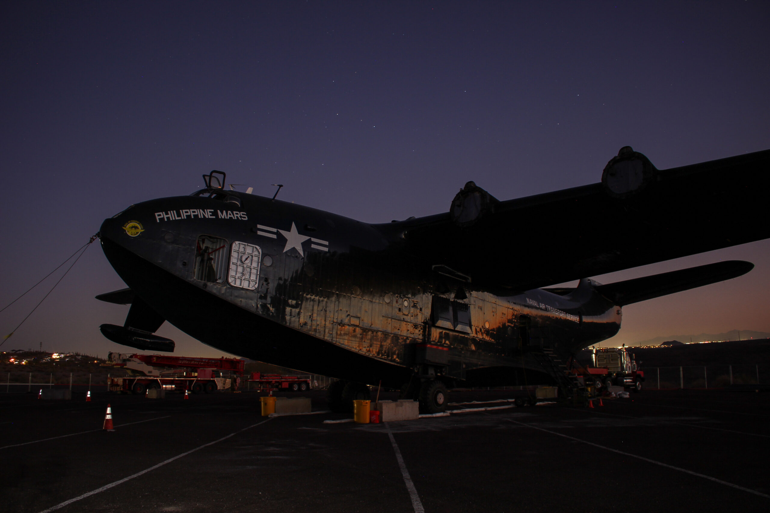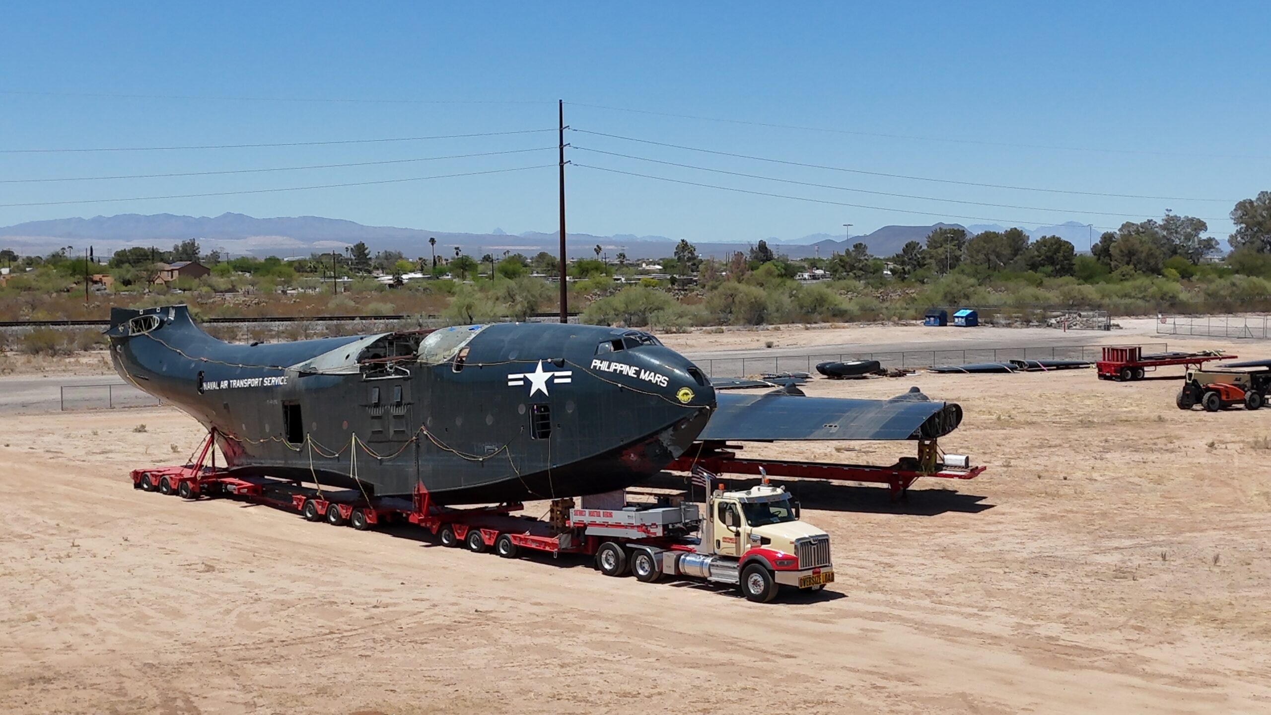 When the weather permitted on February 12th, Philippine Mars was pulled up the boat ramp to be prepared for the final leg of the journey to museum immortalization. A pure flying boat without landing gear, Mars aircraft need large bodies of water to land. It was dismantled at Lake Pleasant for trucks to haul it down to Tucson, Arizona. The fuselage arrived to Pima Air & Space Museum just before midnight on May 16th and the aircraft was reassembled for display piece-by-piece over the following months.